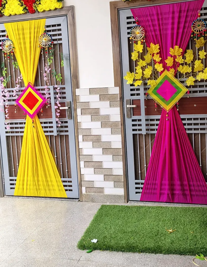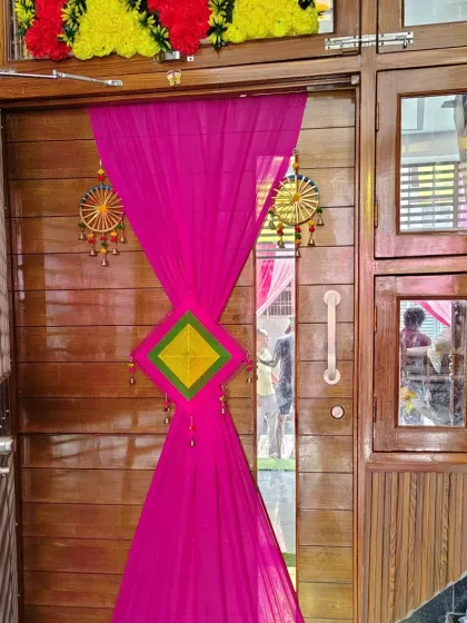I transform homes for pre-wedding functions like Haldi and Mehendi with vibrant decor. This includes traditional elements like marigold flower arrangements, colorful fabric drapes for entrances, and custom flower petal rangoli.