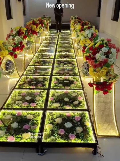I create stunning, illuminated walkways to make the bride's entrance unforgettable. These setups feature glass panels with floral arrangements underneath and are perfect for making a big impression, especially for evening events.
