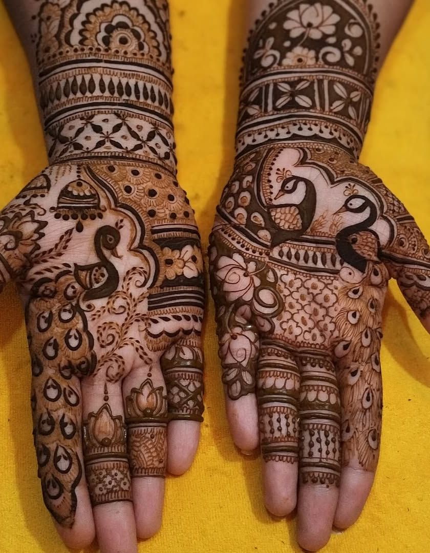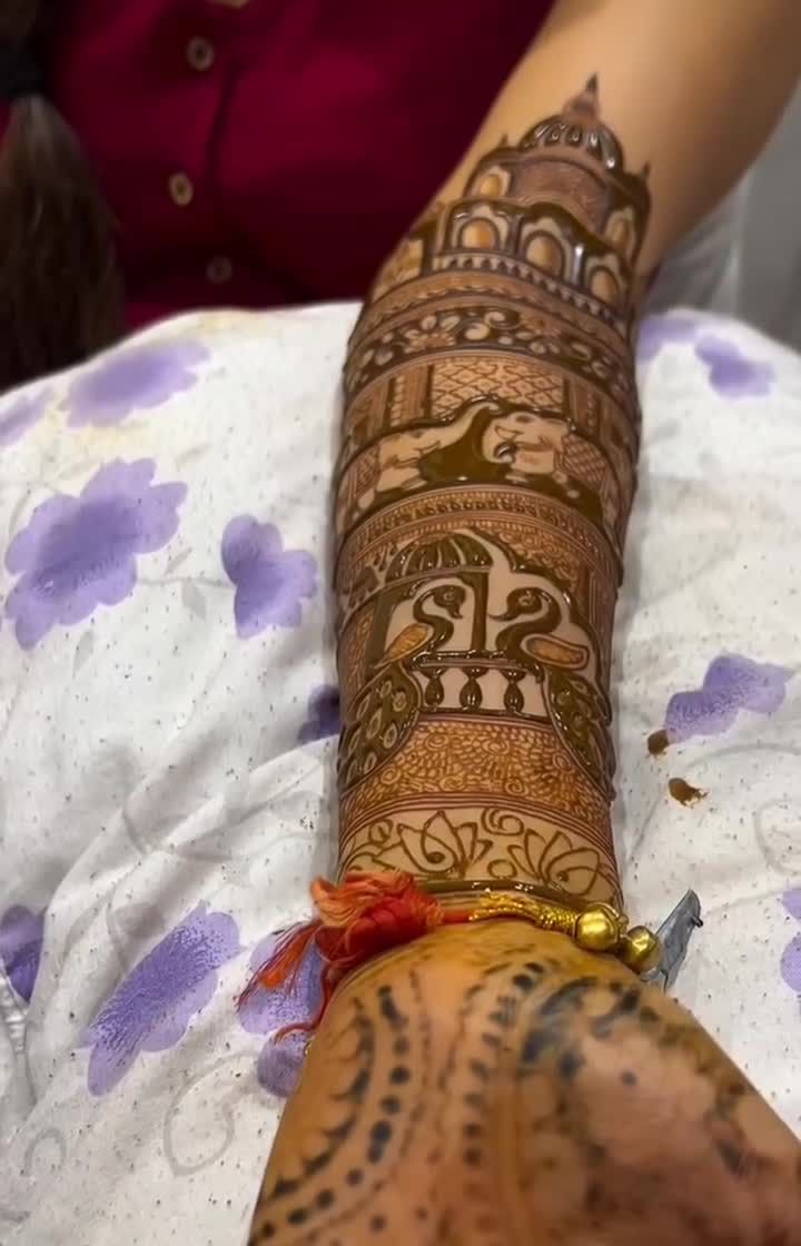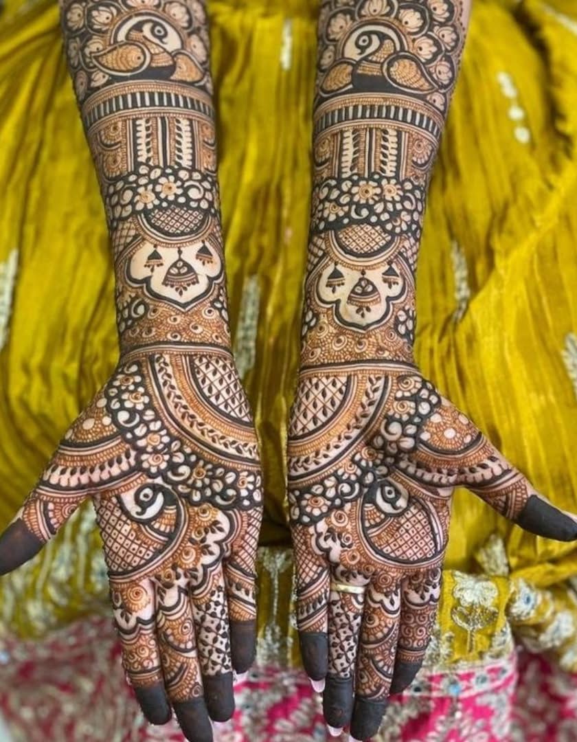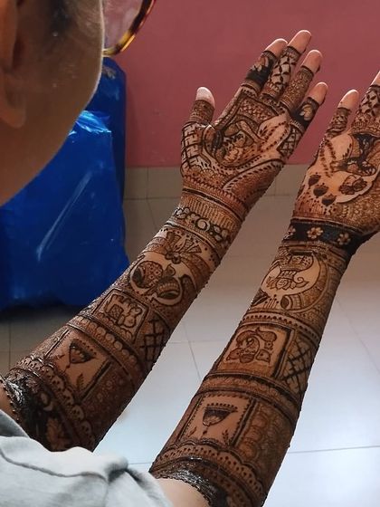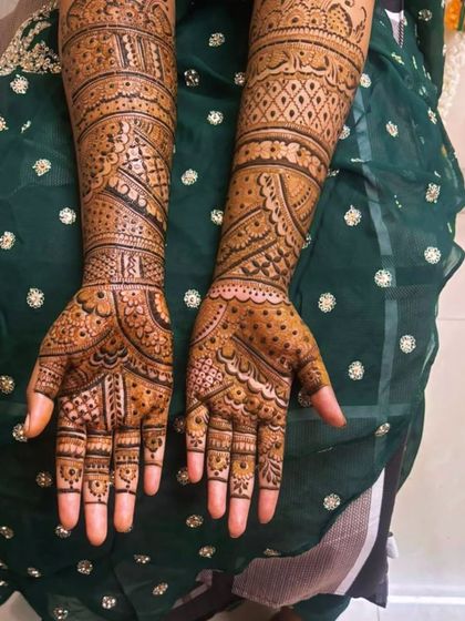 My specialty is full coverage bridal mehandi from fingertips to elbow, with a guaranteed dark stain. I create dense, elaborate patterns in Rajasthani and Marwadi styles, ensuring every inch is beautifully decorated.