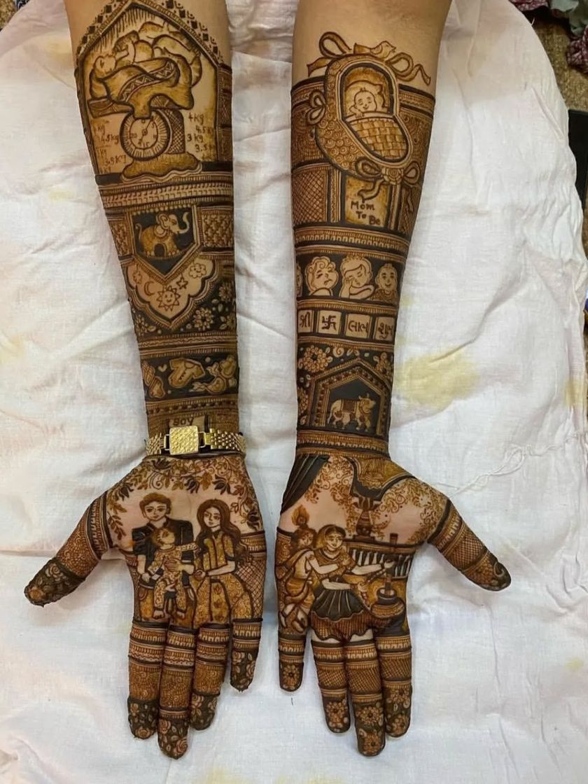Celebrate the upcoming arrival with a special and personalized mehndi design. I love creating unique themes for baby showers, including cute baby figures, cradles, toys, and portraits of the parents-to-be. It's a beautiful way to honor the mother.