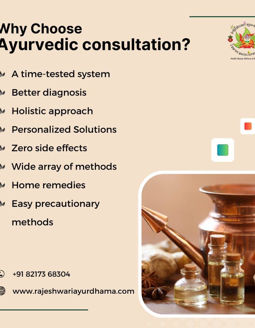 I offer solutions for hair fall, dandruff, and premature greying by nourishing the scalp and strengthening roots. My methods include Keshani Chikitsa (complete hair therapy), Shiro Abhyanga (herbal oil head massage), and Nasya Karma.