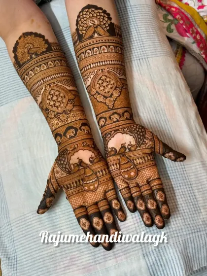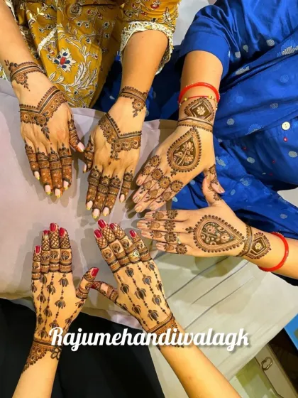 I do quick, neat mehendi for guests and family at weddings, manage large groups smoothly, and offer coordinated designs for close relatives and grooms, all handled by my team anywhere in India or abroad.