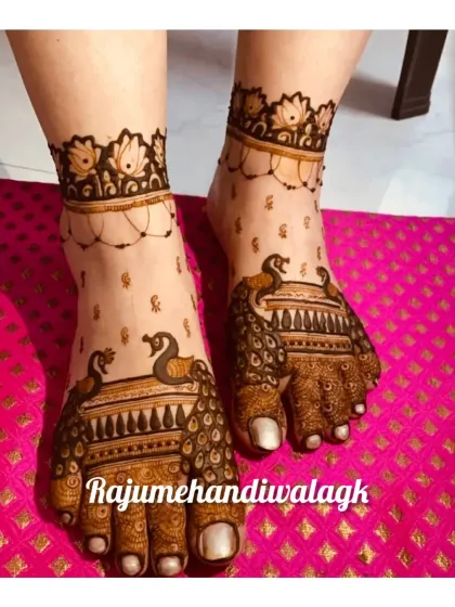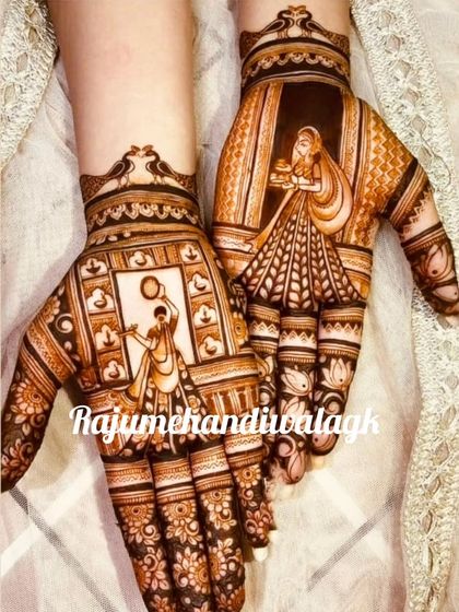 I create bridal mehendi that includes your story, portraits, and personal details, with full hand and feet coverage in both traditional and modern styles.