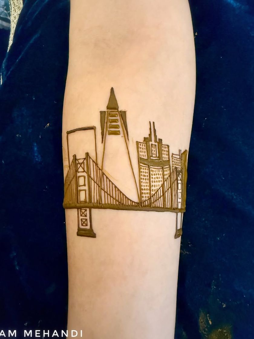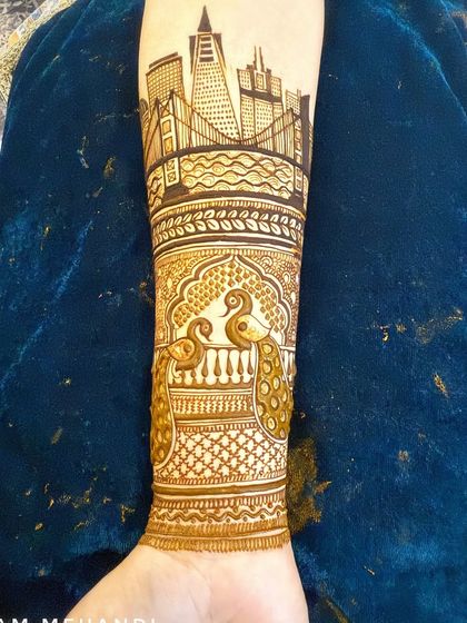 If your story is set in the city, I can draw it. I create custom mehndi designs featuring city skylines, famous landmarks, and architectural elements for a unique and contemporary bridal look.