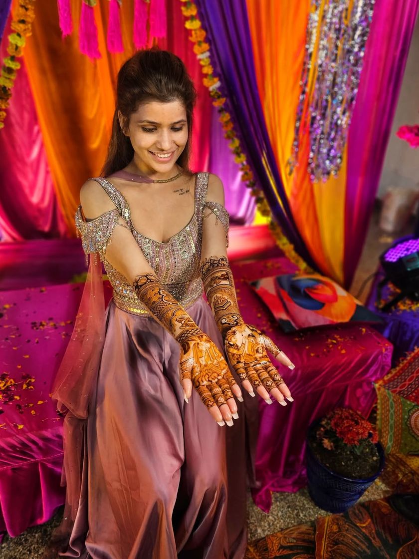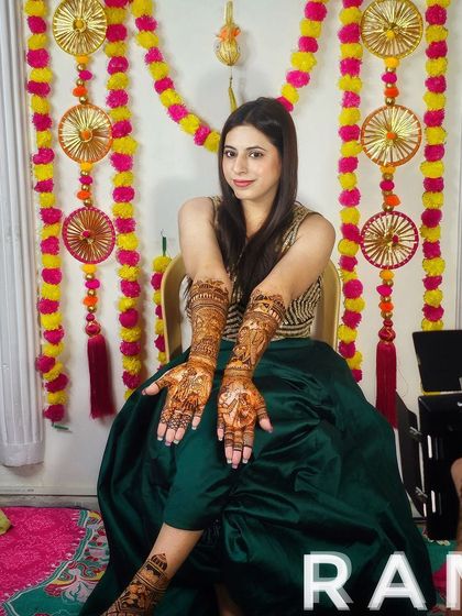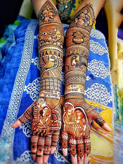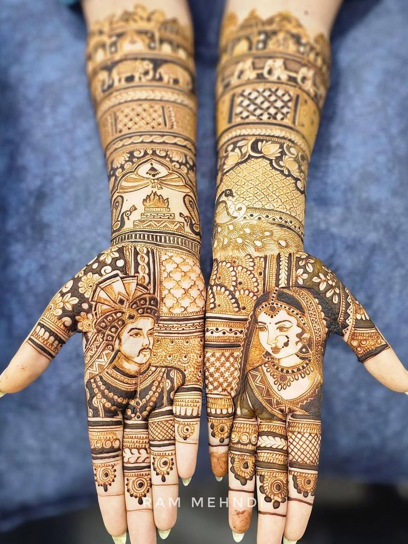 Your bridal mehndi should be your own story, not just a pattern. I specialize in creating detailed portraits of you, your partner, and even your pets, as well as drawing scenes from your life like the jaimala or doli ceremony.