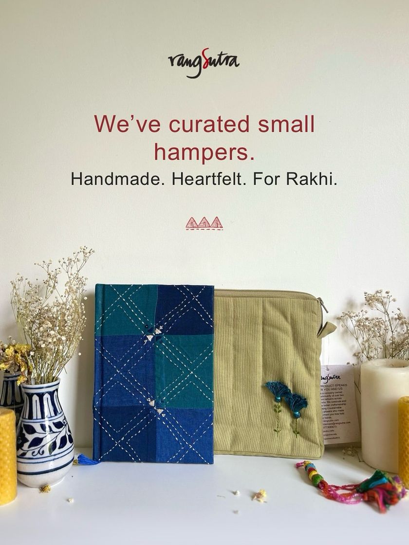 We curate thoughtful, sustainable hampers for festivals and special days like Raksha Bandhan. Each hamper is filled with handmade items like hand-embroidered pouches, fabric-covered journals, and decorative charms, all crafted from surplus fabrics by our artisans.