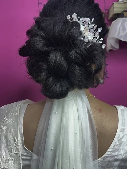 I specialize in creating traditional Indian bridal hairstyles with over 15 years of experience. My expertise includes intricate braiding techniques adorned with floral and gold accessories, particularly for Mugurtham ceremonies featuring golden jade embellishments.