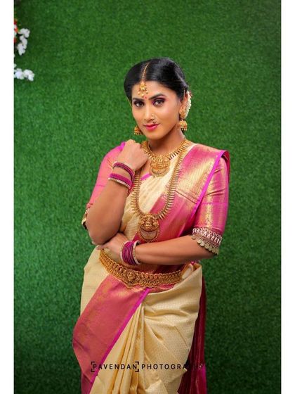 I do South Indian bridal makeup and hair styling with a focus on natural finish, bold eyes, and traditional hairstyles that match your saree and jewellery.