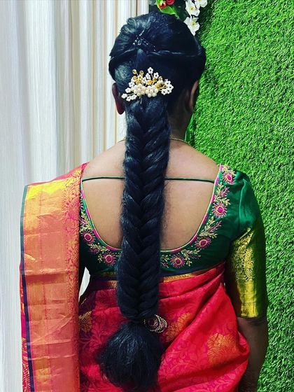Beyond makeup, I provide complete hairstyling services to finish your look. I create a variety of styles including traditional South Indian braids with fresh flowers, elegant updos, and soft curls, all designed to match your outfit and the occasion.