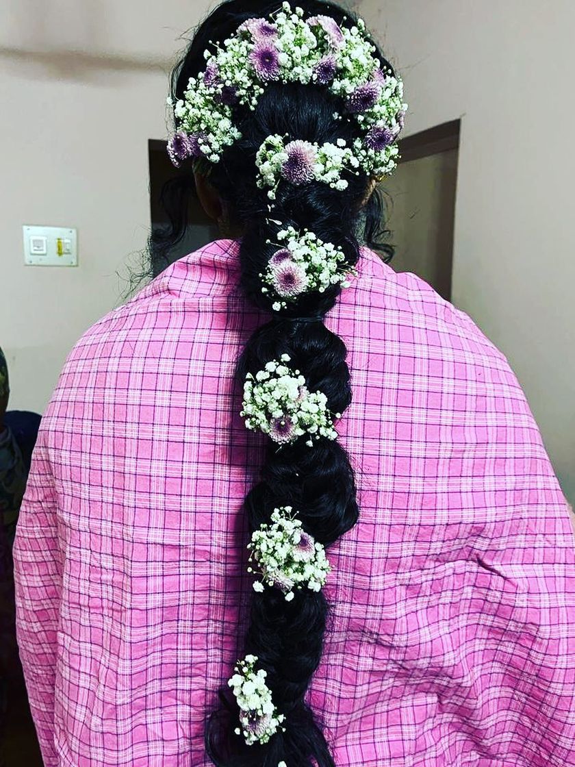 My service includes hairstyling to complete your photoshoot look. I create everything from traditional floral braids that pair beautifully with sarees to modern updos and soft waves for contemporary shoots.