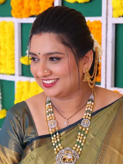Hi, I’m Rashmi! Used to be deep in finance, now I’m all about makeup and art. Swapped spreadsheets for brushes and never looked back. I trained with Manjeet and keep learning every day. My favourite part? Creating South Indian Muhurtham looks, sharing smiles at weddings, baby showers, naming ceremonies. Every client is a new canvas, and seeing them happy is what keeps me going.