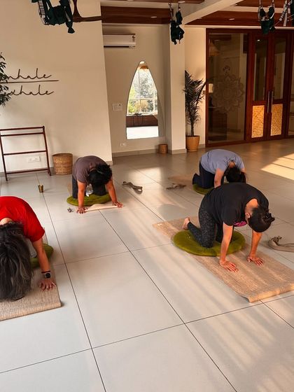 Our Offerings - We do Hatha, Aerial, Wheel, Stick, Chair, Partner and Kids Yoga, chakra balancing sessions, sound healing meditation, pranayama, diet consults, and community circles.