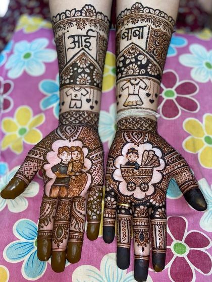 Hey, I'm Ravina. Mehandi is my thing – you know, the kind that speaks for itself. Mumbai is home, and I go all out with my heena, whether it’s a full-on bridal story or something sweet for a baby shower, like ‘Aai’ ‘Baba’ in the design. The best part? When the stain sets and my client grins. That’s my staingoal.
