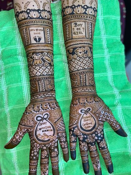 This is my favorite. I like adding personal touches - names, 'आई' (Aai - mother), 'बाबा' (Baba - father), baby shower mehandi motifs like footprints or cradles, and even portraits. You can go super simple or full-on grand.