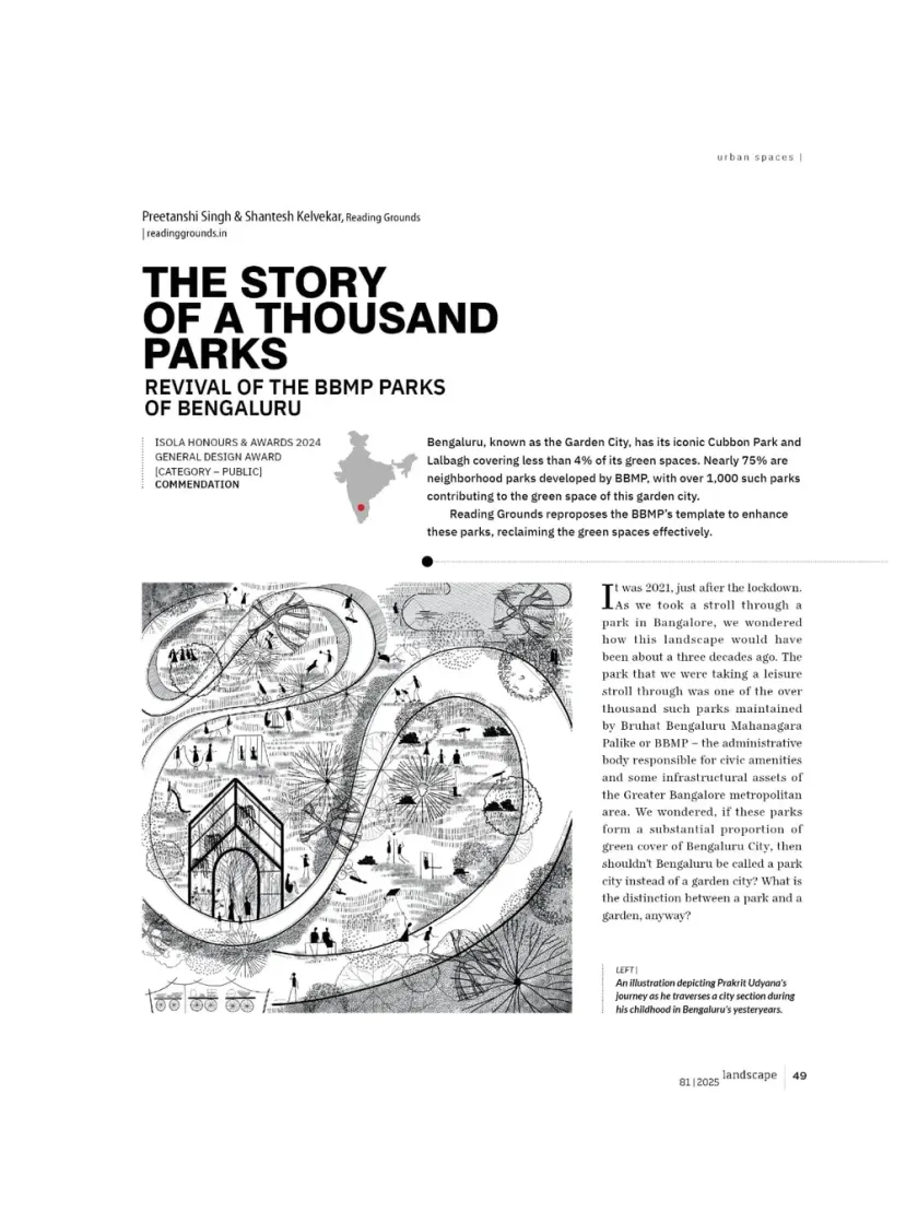 This is a special initiative focused on reimagining public parks in Namma Bengaluru. I work to move beyond the cookie-cutter park model by creating open, accessible, and engaging spaces that cater to all age groups and reflect the needs of the local community.