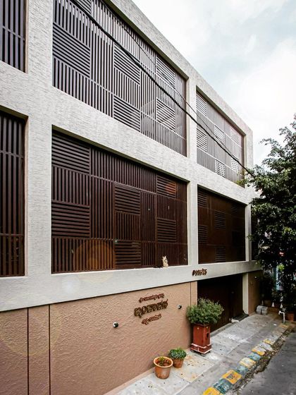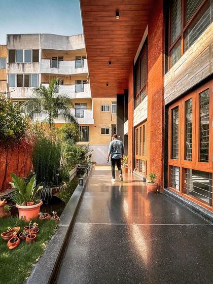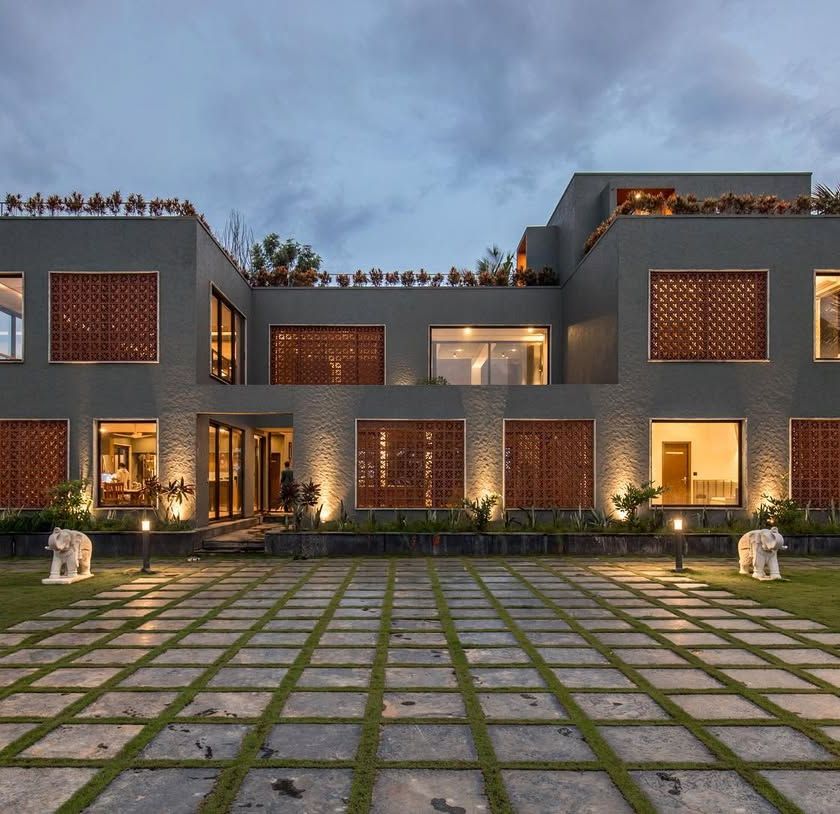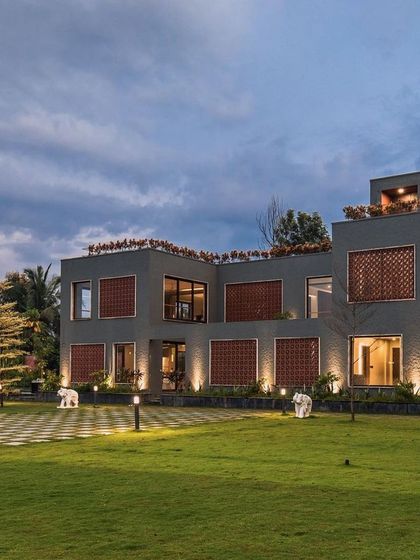Explore our internationally recognized project, a contemporary private residence on the outskirts of Bengaluru. This design focuses on a grotto-like structure with grey textured paint, clay jali walls, and a seamless connection between indoor and outdoor living spaces, including a pool and sunken lounge.