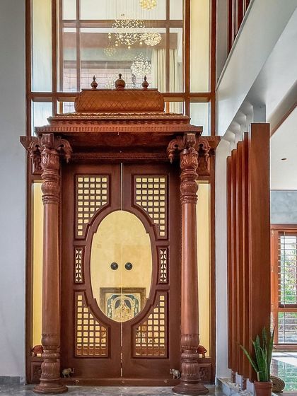 - Solid Wood Carving: Bespoke, hand-carved solid teak wood elements for main entrance doors and ornate Pooja room columns.