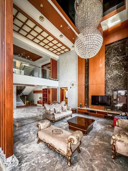 - Luxury homes with double-height living areas, crystal chandeliers, dark marble, and polished wood - all about opulence and drama.