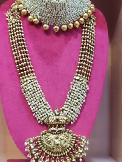 Browse my extensive collection of rental jewellery up close. Here you can see the details of each piece, from antique temple harams and chokers to modern diamond-look sets, all displayed clearly for your selection.