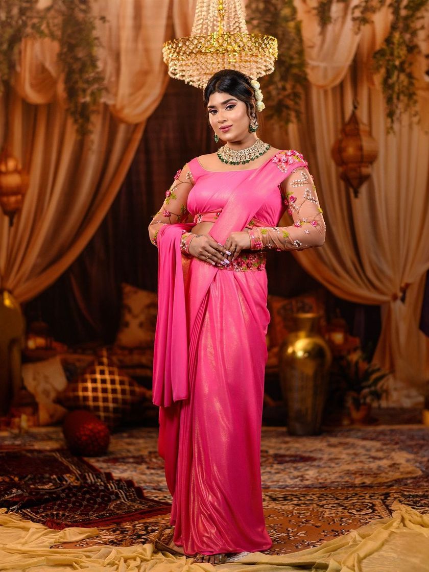 Step back in time to the golden age of cinema with our 'Om Shanti Om' recreation. We capture Shantipriya's classic elegance with a shimmering pink saree, a floral hair bun, and makeup that reflects the distinct retro glamour of the era.