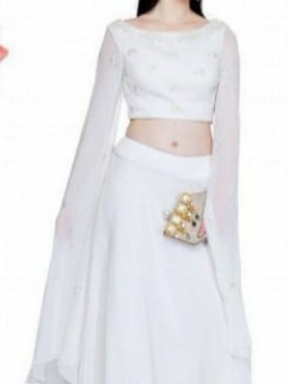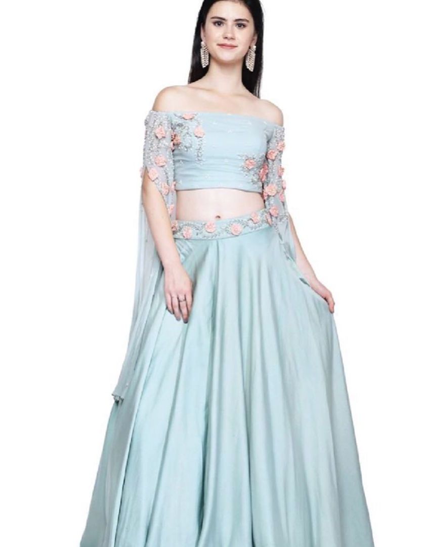 Find your perfect wedding or festive look in our collection of discounted designer lehengas. We offer a variety of styles, from traditional embroidered sets to modern crop tops with skirts and trendy ruffled designs.