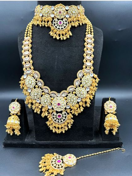 This is our most popular category for brides who want a royal, statement look. These sets include everything from elaborate rani haars to elegant chokers, all designed to be lightweight and comfortable for your big day. We have a variety of designs with white, green, or ruby-colored stones.