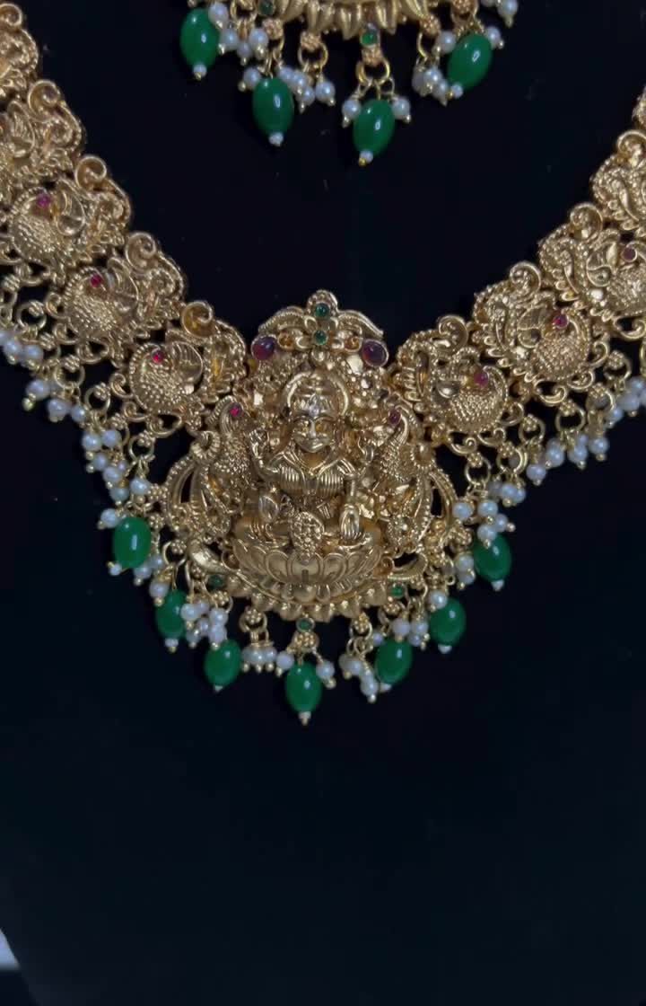 Get the divine look with our beautiful South Indian temple jewellery sets available for rent. These pieces feature intricate carvings of Goddess Lakshmi and peacocks, typically including a choker and a matching long haaram.