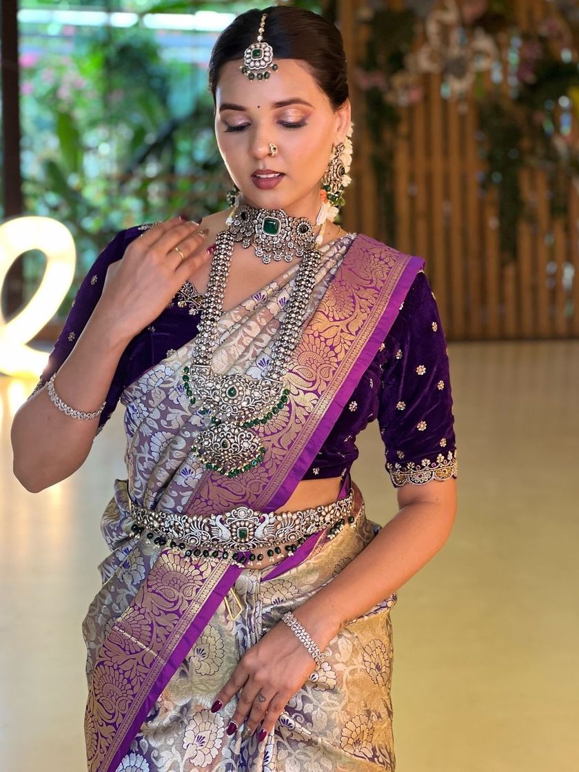 For a contemporary and chic bridal style, I offer a stunning collection of silver-finish and oxidized jewellery. Often studded with emeralds, diamonds, or pearls, these sets provide a sophisticated look that stands out. They are perfect for receptions or engagements, especially when paired with rich fabrics like velvet or silk in deep jewel tones.