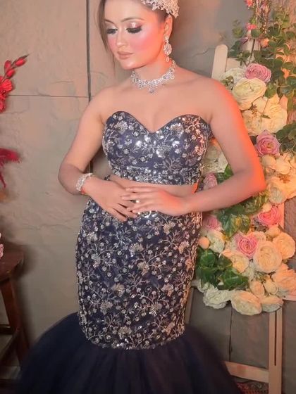 Here you will find my collection of glamorous outfits perfect for your cocktail, reception, or engagement party. I have a variety of styles, including sequined gowns with trails, modern drape sarees, and chic Indo-Western crop top and skirt sets. These are available in many colors, with black, blue, and silver being popular choices.