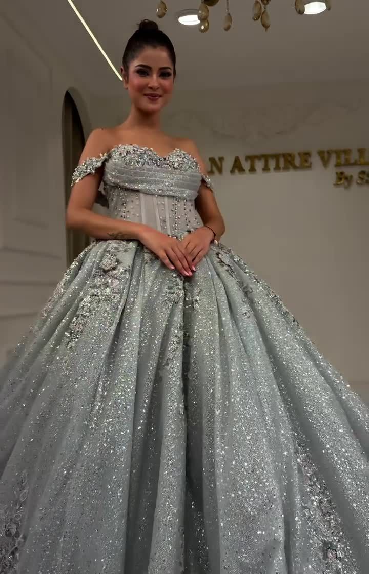 Live your Cinderella moment with my collection of princess ball gowns. These feature voluminous skirts, intricate embroidery, and shimmering fabrics, perfect for engagements, receptions, or any photoshoot where you want to feel like royalty. I offer a variety of styles, from classic off-shoulder designs to modern floral-embroidered creations.