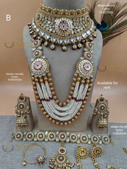We offer an extensive collection of bridal jewelry available for rent across India. Our collections include Rajwada bridal sets, designer Kundan jewelry with Minakari work, antique-look pieces, and temple jewelry featuring intricate designs with gold tones and precious stones.