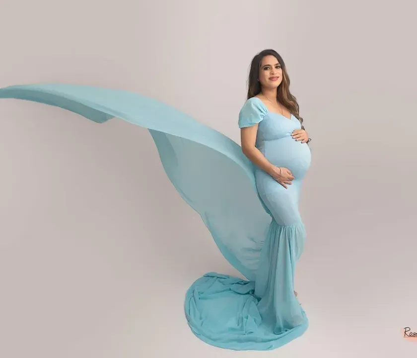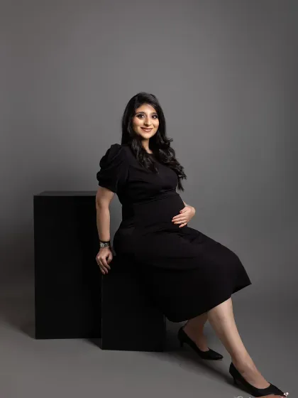For moms-to-be who want to feel like a star. I use dramatic lighting, bold backdrops, and elegant gowns from my studio wardrobe to create striking, high-fashion portraits that celebrate your glow. This includes everything from classic dark backdrops to vibrant, colorful setups.