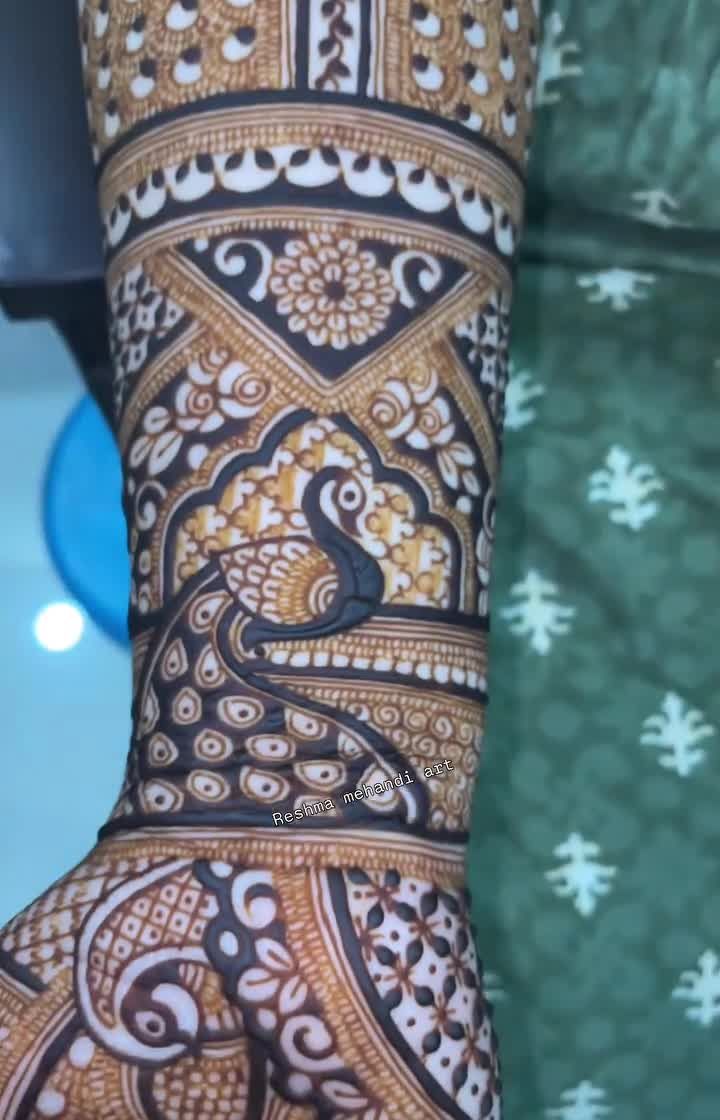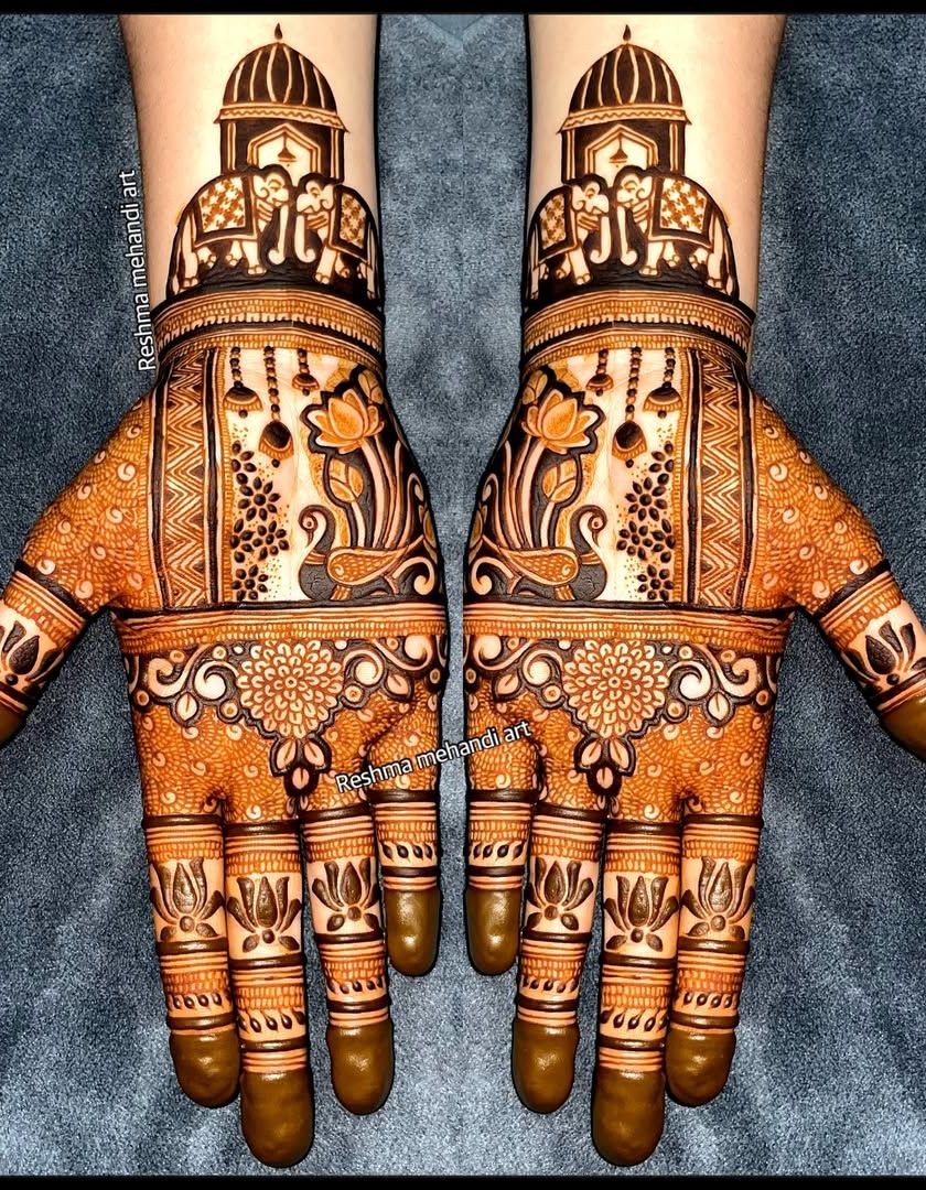 For the classic bride who loves timeless beauty, I create intricate full-arm mehandi filled with traditional motifs. These designs feature royal elephants, majestic peacocks, lotus flowers, and grand palace domes, all woven together with super fine lines and detailed patterns.