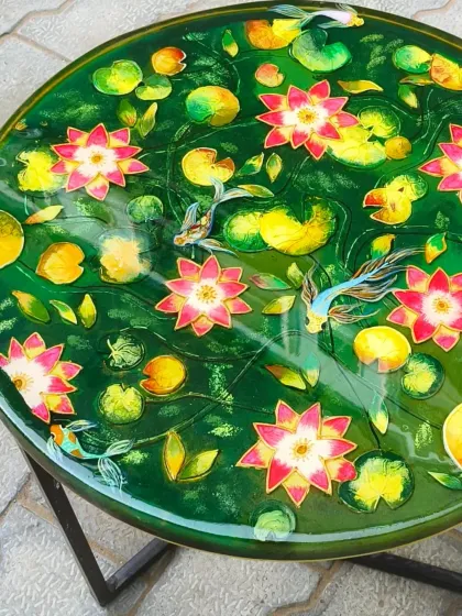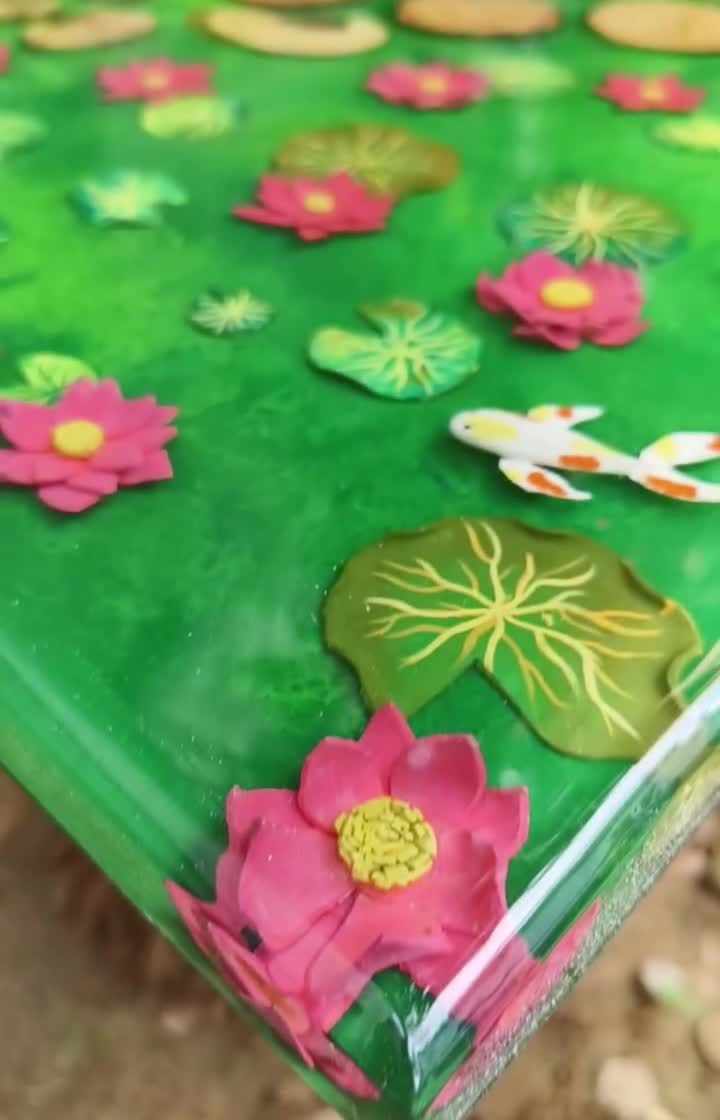 Inspired by the tranquility of nature, my lotus pond series brings a sense of calm to any space. I create these serene scenes on tables and mirrors, using hand-painted 3D lotuses, koi fish, and lily pads embedded in deep green resin to craft a peaceful, everlasting garden.