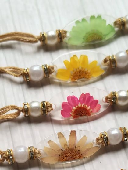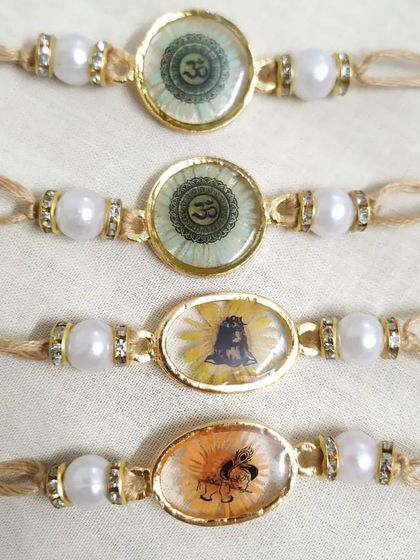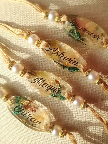 We make custom resin rakhis with names, photos, flowers, and spiritual designs that last beyond Rakshabandhan and can be kept as keepsakes.