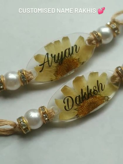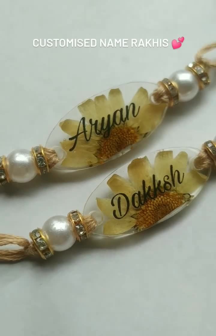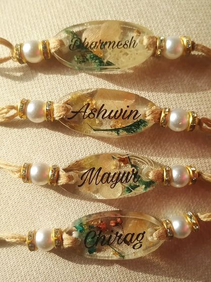 Make it truly personal by getting your brother's name, or a sweet term like 'Bhai' or 'Pyara Bhai', encased in a beautiful resin rakhi. I offer various shapes like oval and rectangle, and can add elements like preserved flowers or gold flakes to match your vision.