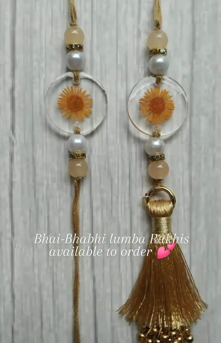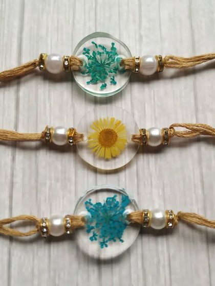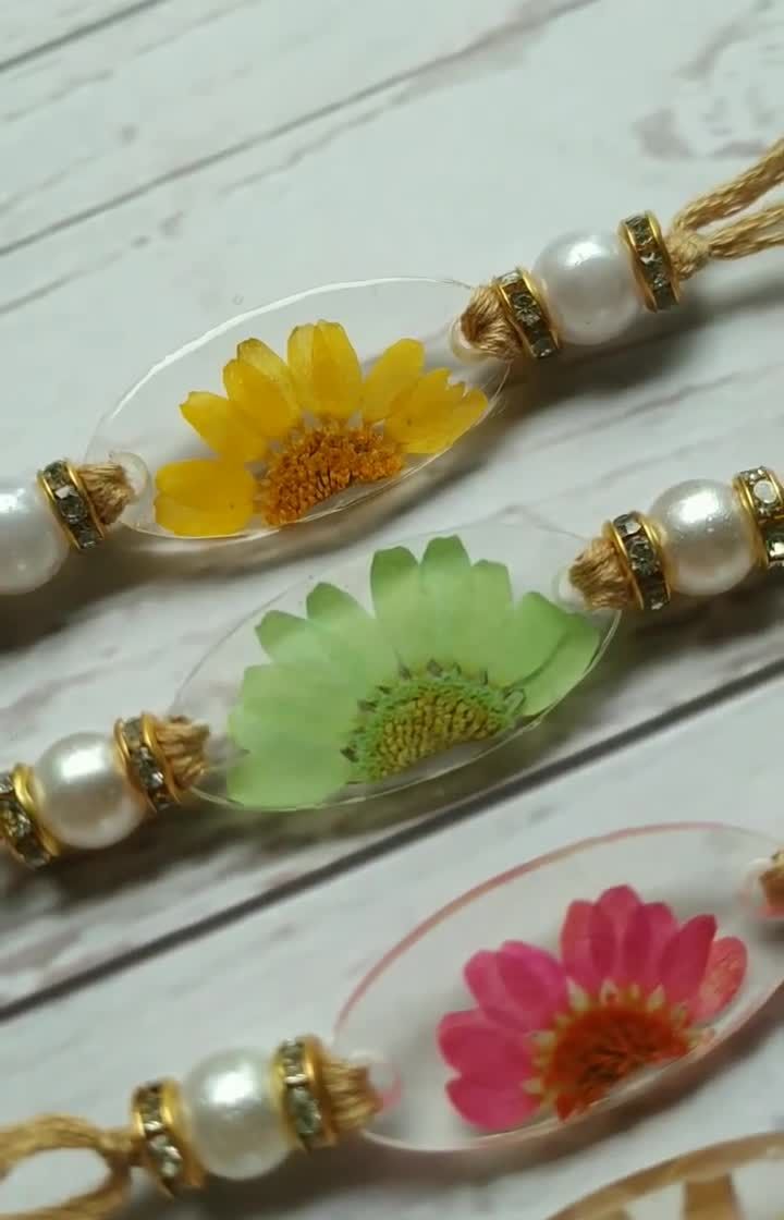 I love capturing the beauty of nature in my art, and these rakhis are the perfect example. Each one features real, carefully pressed and preserved flowers, like vibrant daisies and delicate baby's breath, sealed in crystal-clear resin.