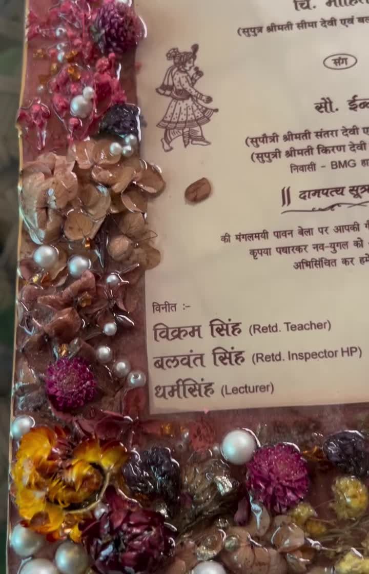 I create beautiful resin frames for preserving sacred wedding texts like 'Shubh Shiksha', 'Sehra', and even your wedding invitations. These pieces honor your family's traditions and become cherished heirlooms, capturing the blessings and emotions of your ceremony.