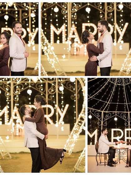 We create cinematic pre-wedding films with candid moments, using 55+ themed sets at our private location or heritage and destination spots, with props and guidance for natural shots.