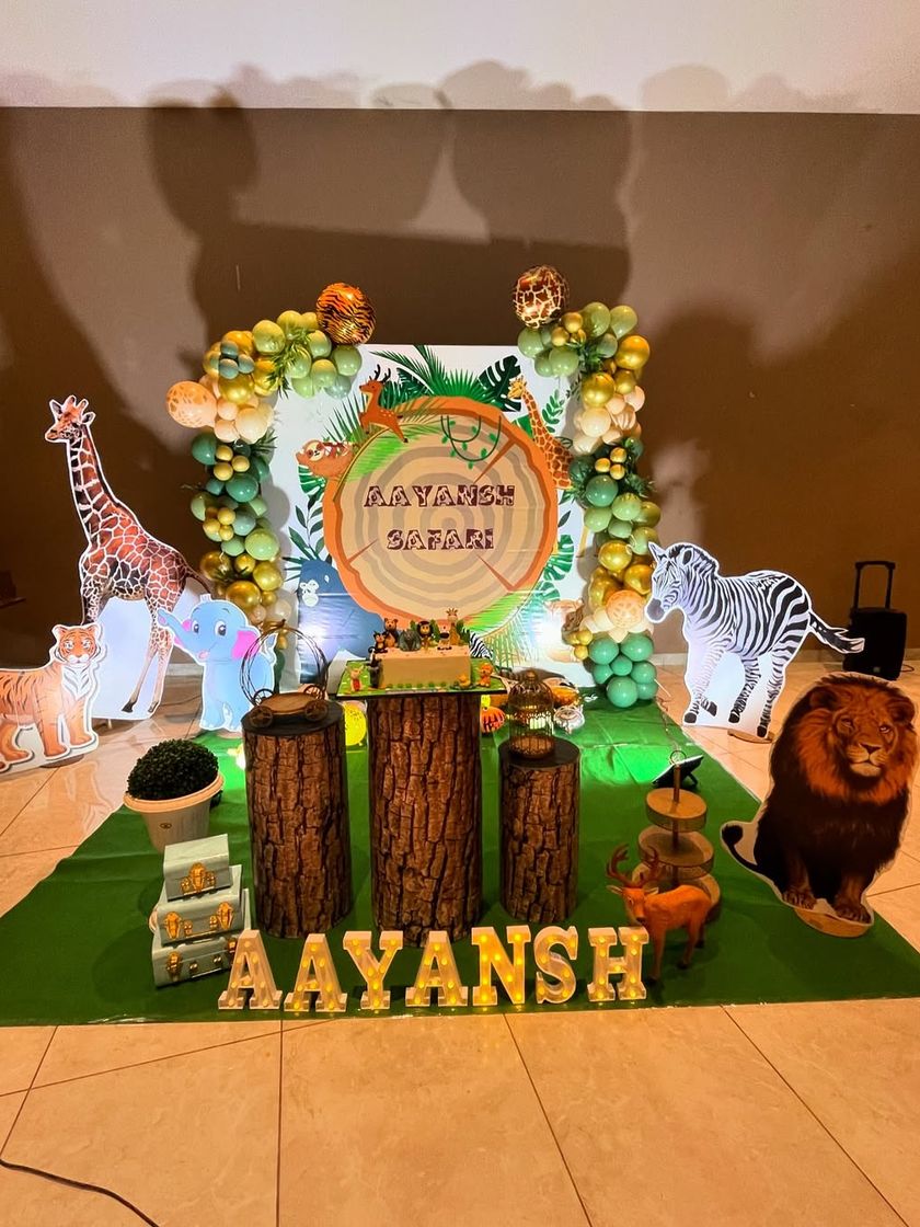 I bring the excitement of a safari to your party with my jungle-themed decorations. These setups feature lifelike animal cutouts, balloon garlands in earthy tones, log-like plinths for the cake, and personalized safari signs to make your little explorer's day unforgettable.