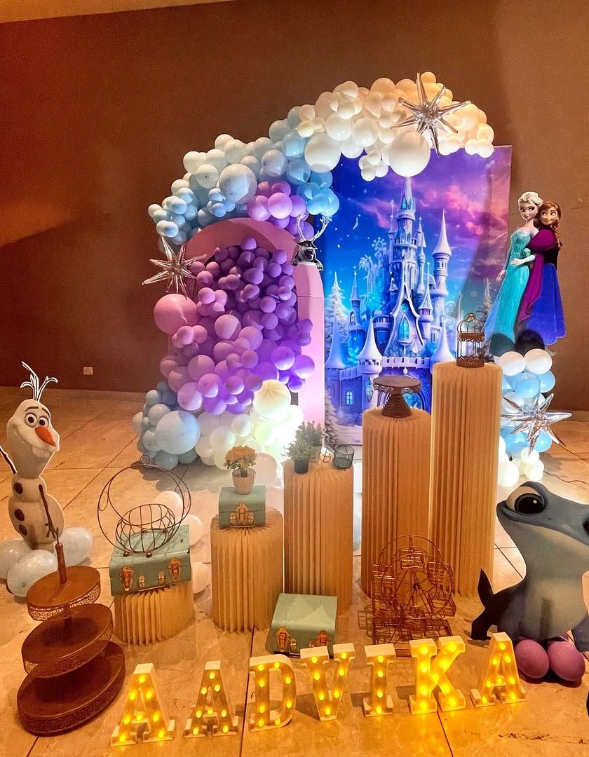 I create a complete winter wonderland inspired by the world of 'Frozen'. These parties feature custom backdrops of Arendelle's castle, balloon decorations in icy blues, purples, and whites, and life-sized cutouts of beloved characters like Elsa, Anna, Olaf, and Bruni.