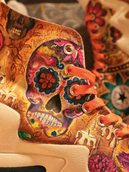 We work together - your ideas, my skills. You bring me a theme (anything, really), I send you a digital mock-up, and we tweak till you’re happy. Once you approve, I hand-paint everything in layers with Angelus Leather Paints. The finished piece is waterproof and chip-proof, so you can actually wear your art.