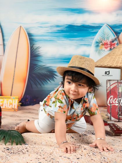 We specialize in capturing your toddler's precious milestones through creative themed photoshoots. Our sessions feature playful setups with props like surfboards, guitars, and toy trucks, complemented by themed backdrops and age-appropriate decorations.