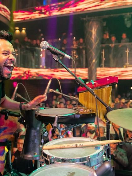 My setup changes with every show. Sometimes it’s Bollywood percussionist for weddings, sometimes it’s world percussion—Djembe, Congas, Darbuka. Indian folk with Dhol, Tabla, or modern with a full drum kit, even electronic pads. I only use pro gear because good sound matters, always.