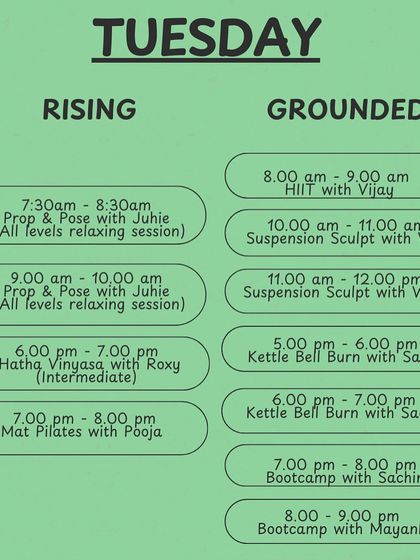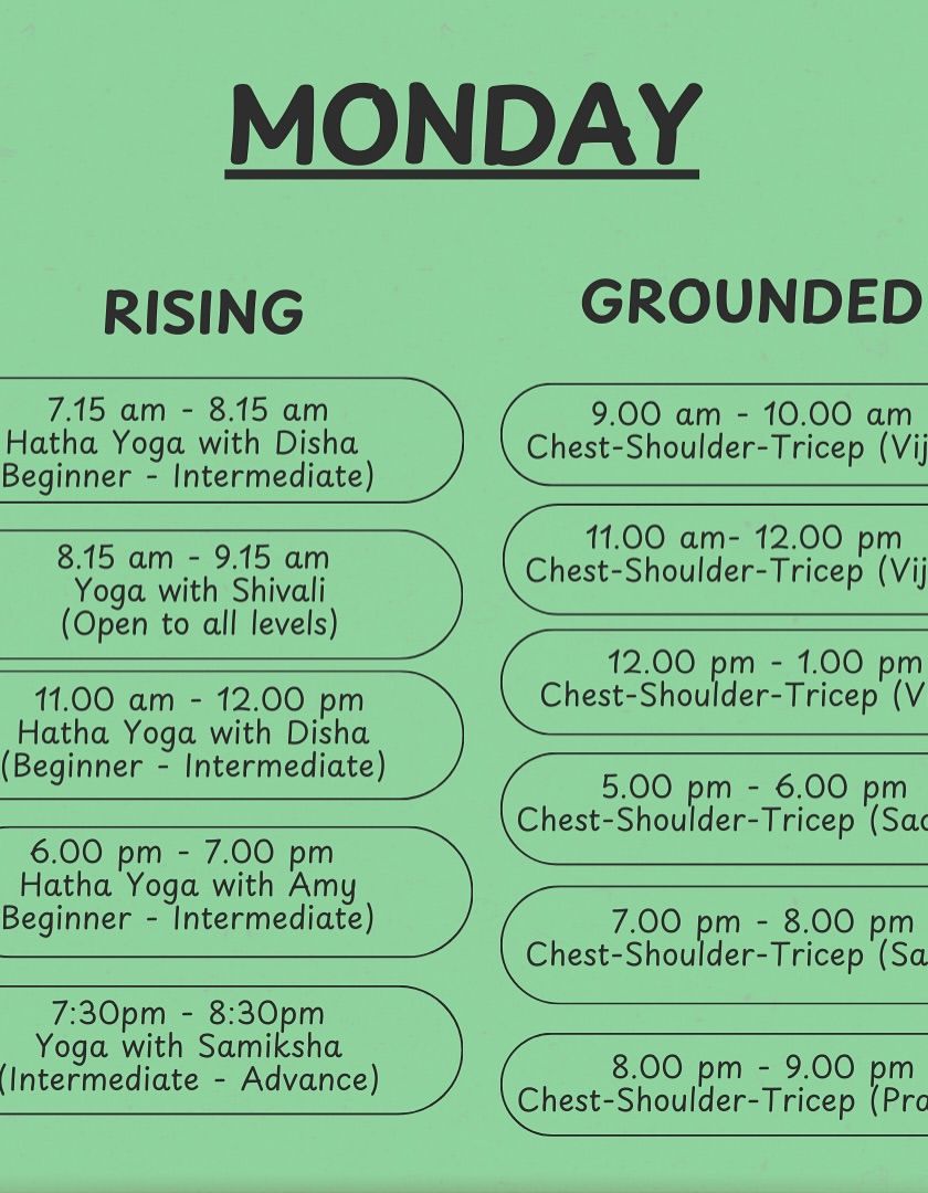 I offer a versatile schedule of classes throughout the week to fit your routine. Explore our daily offerings in both the RISING and GROUNDED spaces and book the session that aligns with your goals for the day.