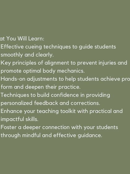 We focus on practical, hands-on skills to help you guide students safely and effectively. Our small group settings ensure you receive personal feedback on everything from body mechanics to deepening poses with confidence.