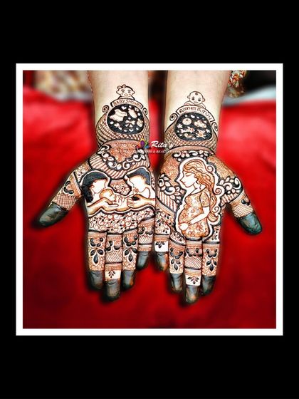 I create intricate and symmetrical bridal mehendi designs featuring traditional motifs like peacocks, florals, and cultural symbols. Each design is personalized to tell your unique love story through elements like couple portraits, initials, and wedding dates.
