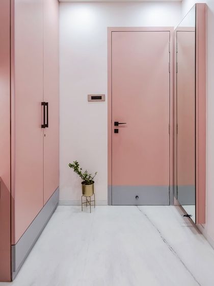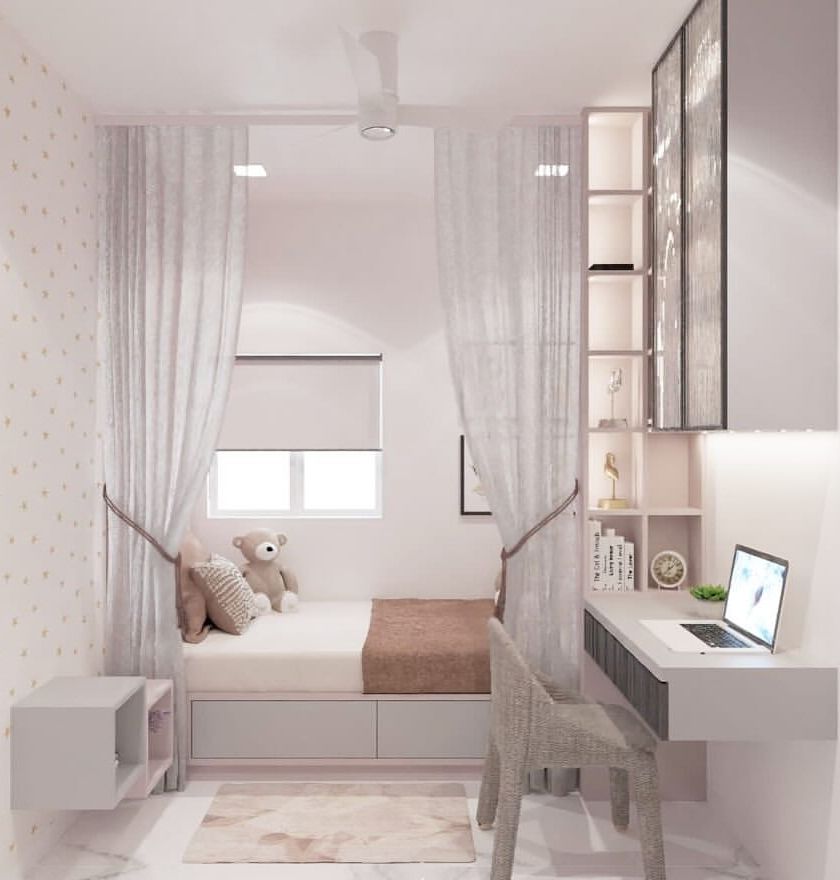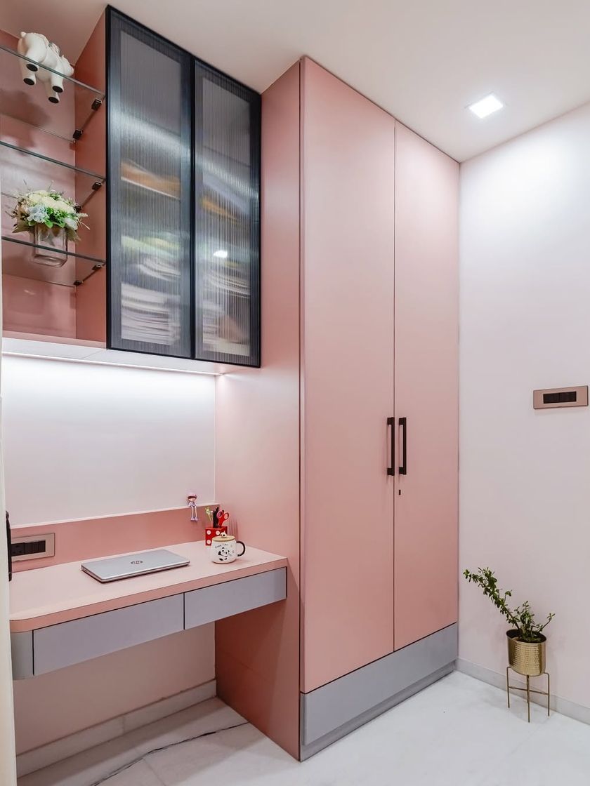 I designed this space using a soft pastel palette to create a serene and stylish sanctuary. The room features a fully integrated unit combining the wardrobe and a compact study desk, a custom upholstered headboard, and clever use of space to maximize both comfort and function.