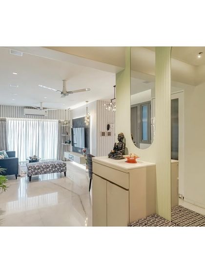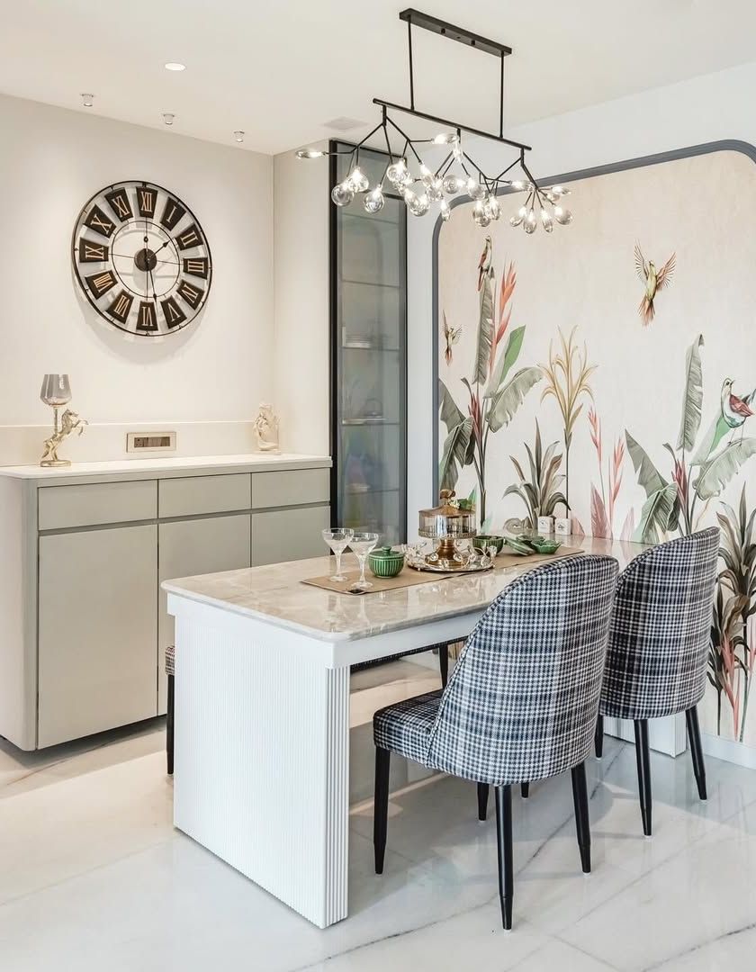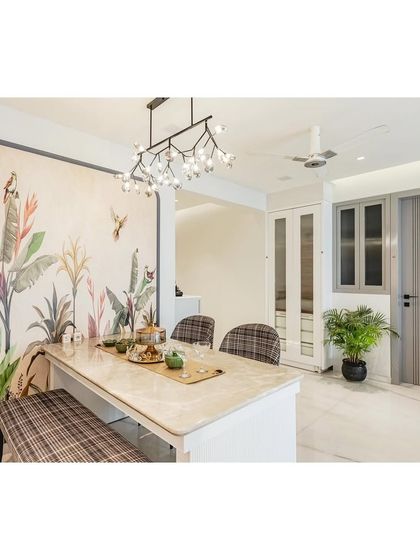 I design dining areas to be more than just a place to eat; they are a centerpiece for your home. This includes selecting statement lighting, unique tables with marble or fluted wood bases, and creating a distinct mood with features like custom wallpapers or integrated crockery units.