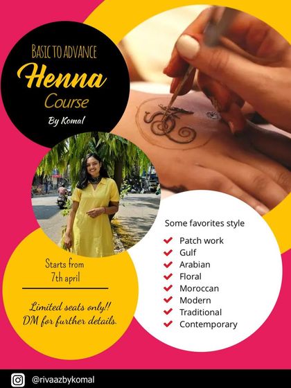 I do custom henna designs for events and festivals using only natural henna, with options for colored henna and personal touches for each occasion.